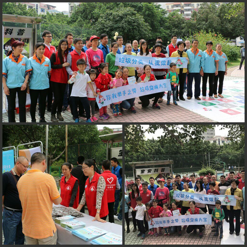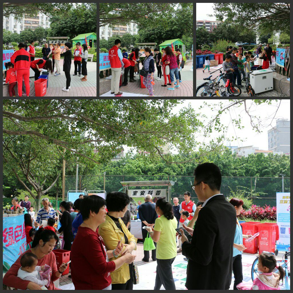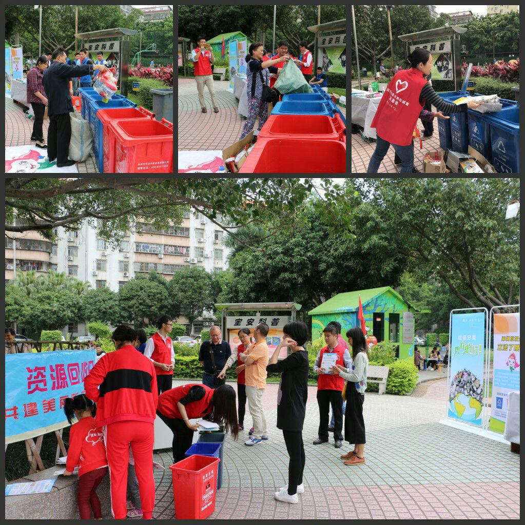 2017年4月15日上午9時,“藍馬甲”市公務員志愿者、新安城管科、義工聯志愿者、源創環保科技有限公司及三盛環保公司聯合在寶安新村開展“綠色星期六,資源回收日”活動。現場參加活動居民人數大約300人。向居民宣傳垃圾減量分類的意義,引導居民學會物盡其用、垃圾分類投放,并且在現場派發300多份宣傳指導手冊及200多份禮品,組織開展親子活動進行垃圾分類小游戲。此次活動回收了廢紙皮50約多斤、廢塑料約20多斤、廢金屬約2斤、廢光管20條、廢電池約0.5公斤。垃圾分類,共建美麗新安。